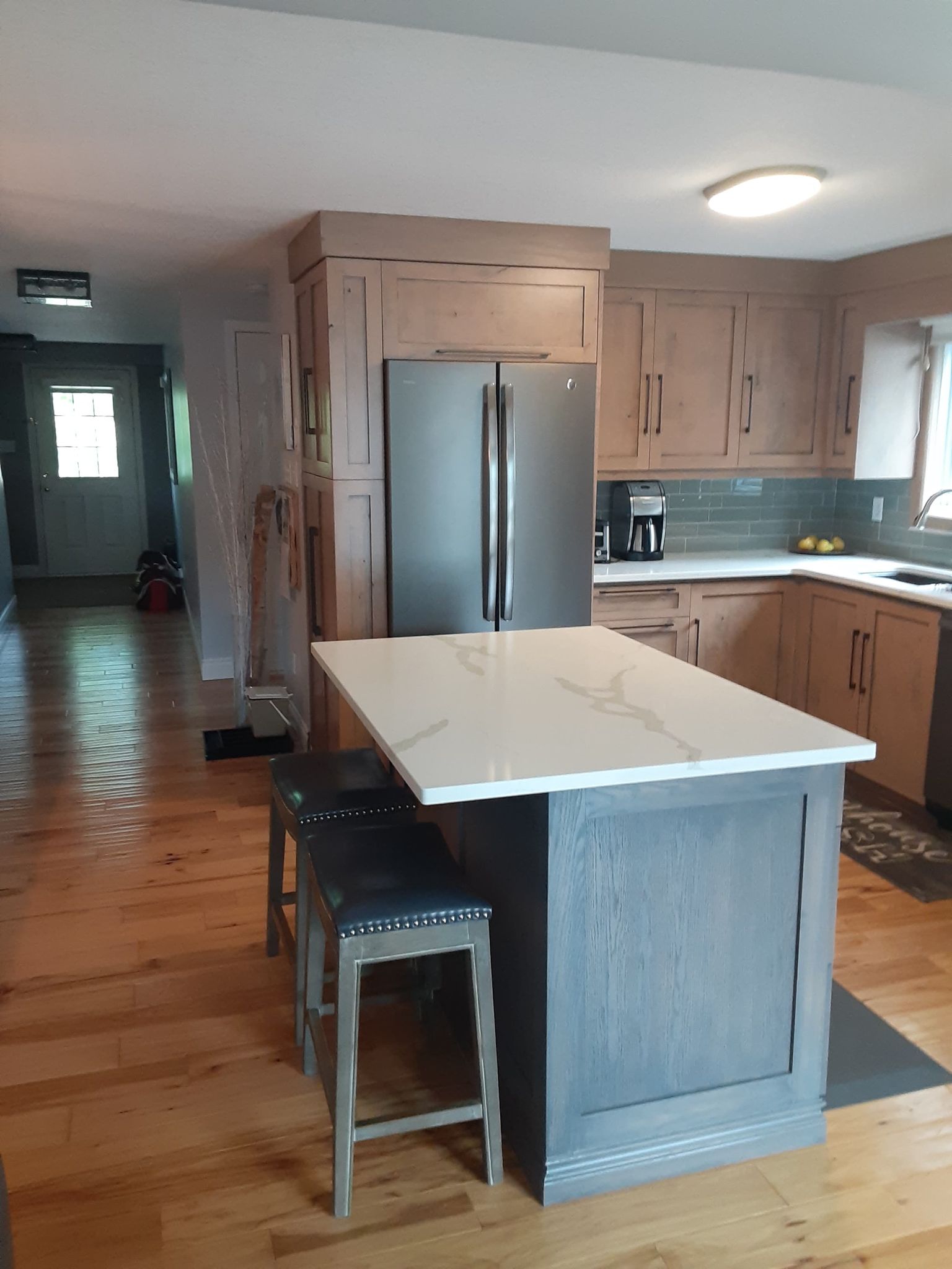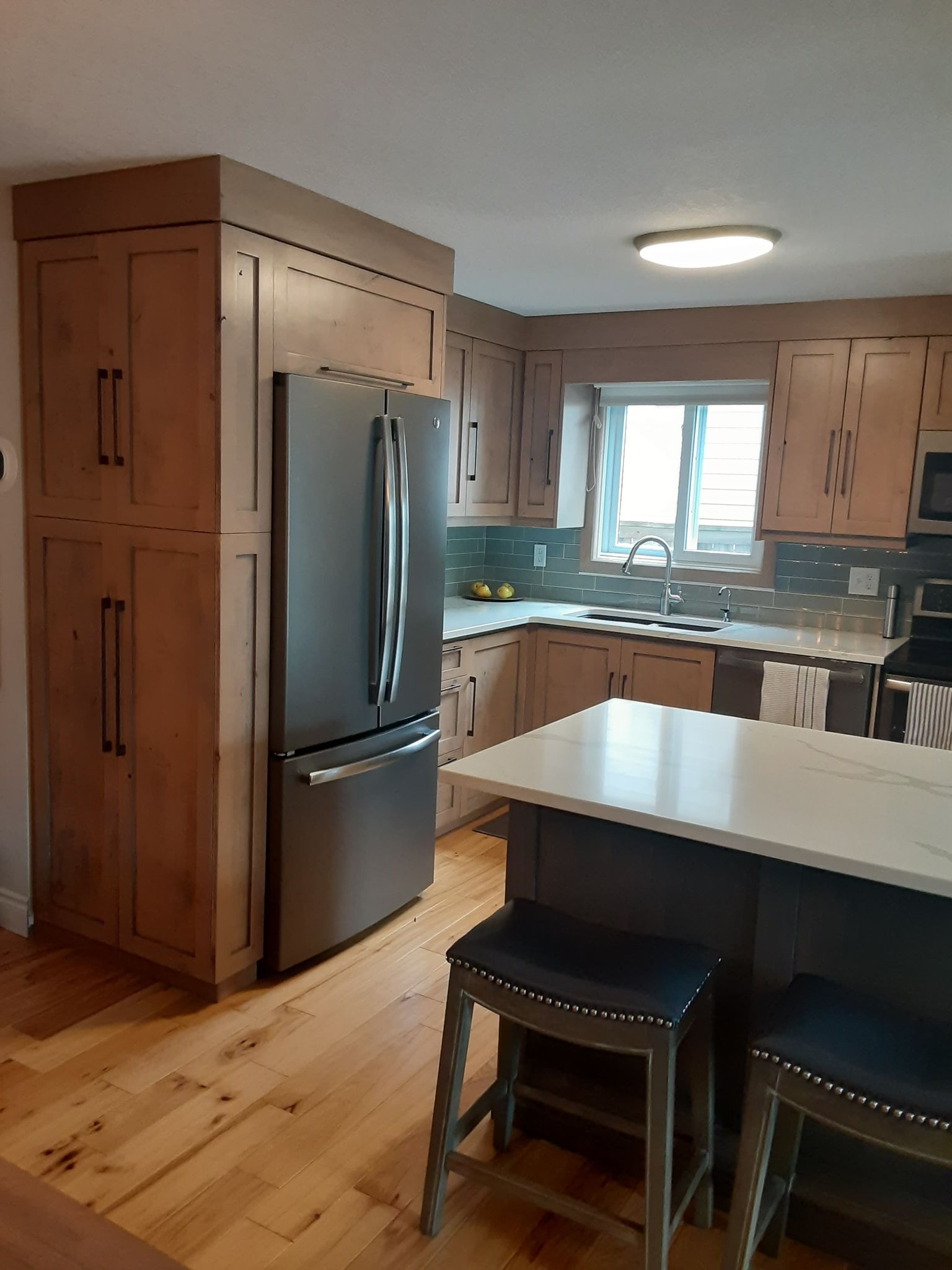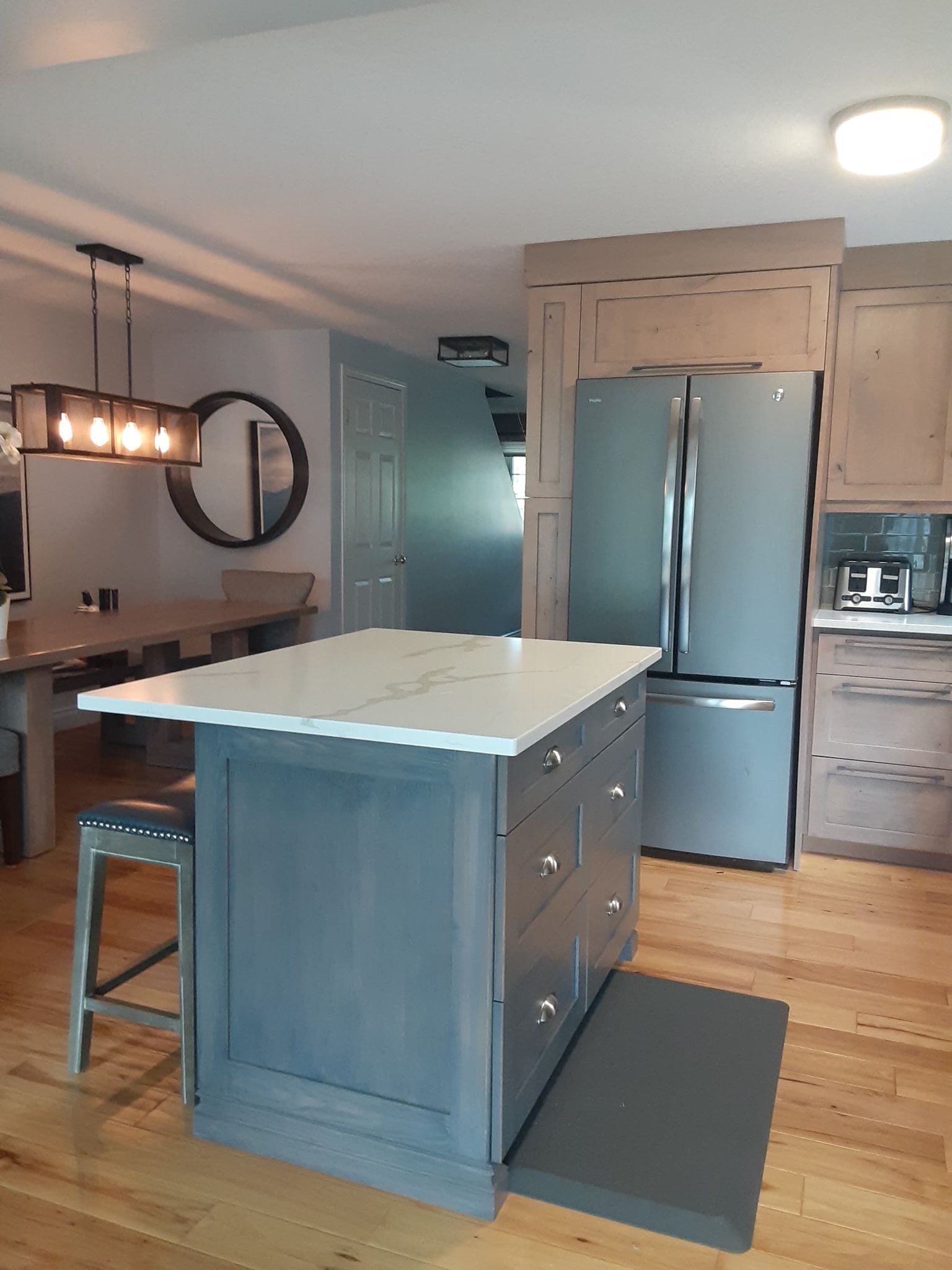 Hand finished in custom natural stain. This kitchen has the soft appeal that is easy and gentle on your eyes.